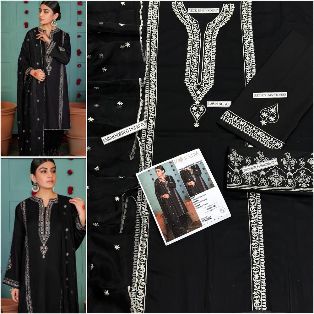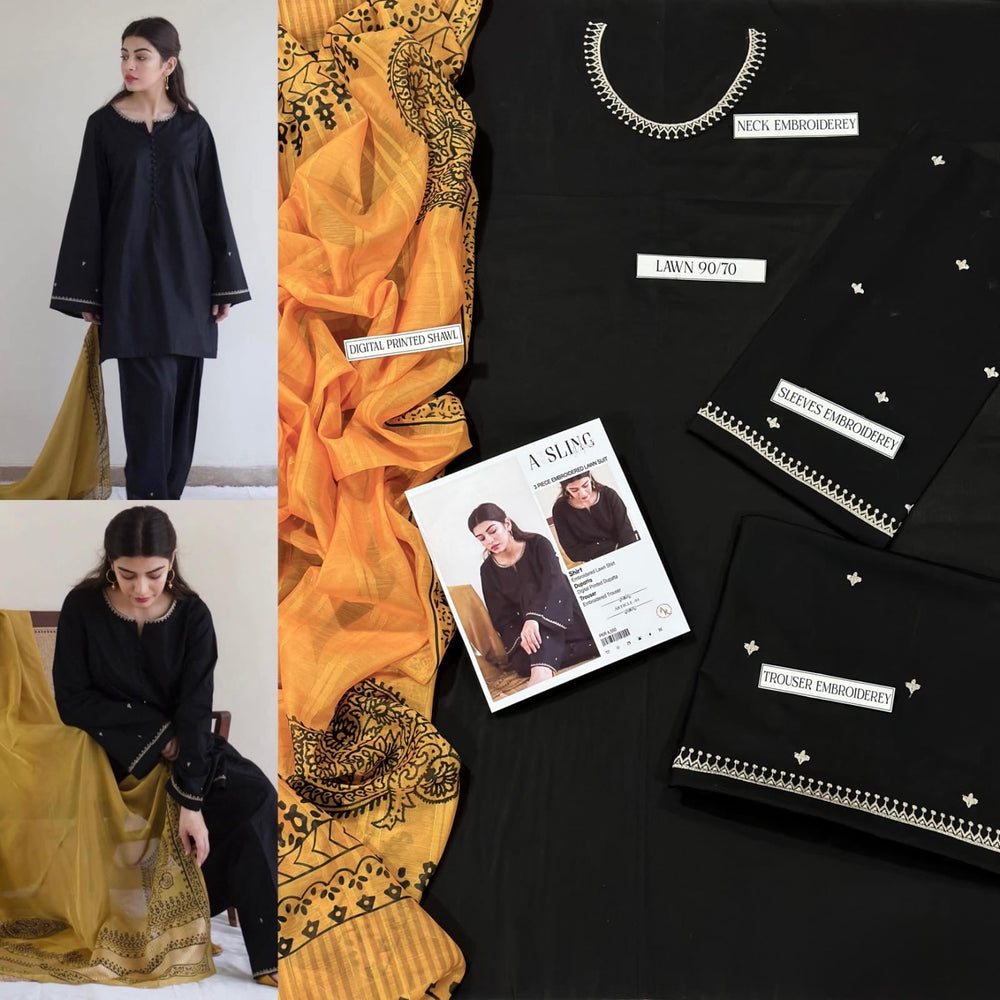 Experience warmth and style with our Summer HOT Selling Aslign & Urge Embroidered 3 Piece set. Made from a soft Lawn Cotton fabric, this set includes an embroidered shirt, trouser, and a printed shawl. Stay cozy and fashionable this season with our must-have winter wear!